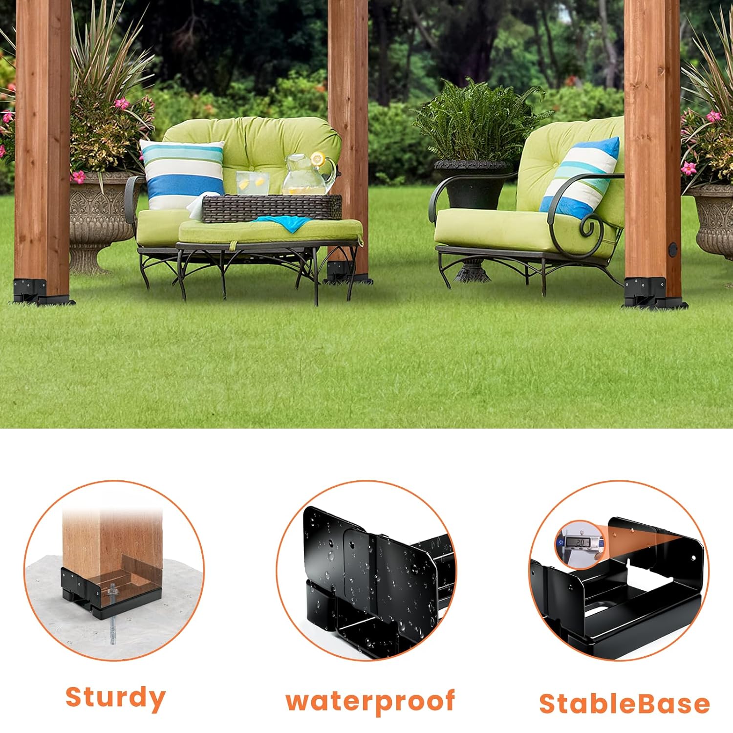 • ?????? ?????? & ???? ????????????: Compared with other 6×6 post anchors,our post anchor features a 1″ standoff from the ground,effectively preventing rot and infestation.Additionally,the adjustable level design of our 6×6 pergola bracket kit makes installation easier,saveing time and effort.