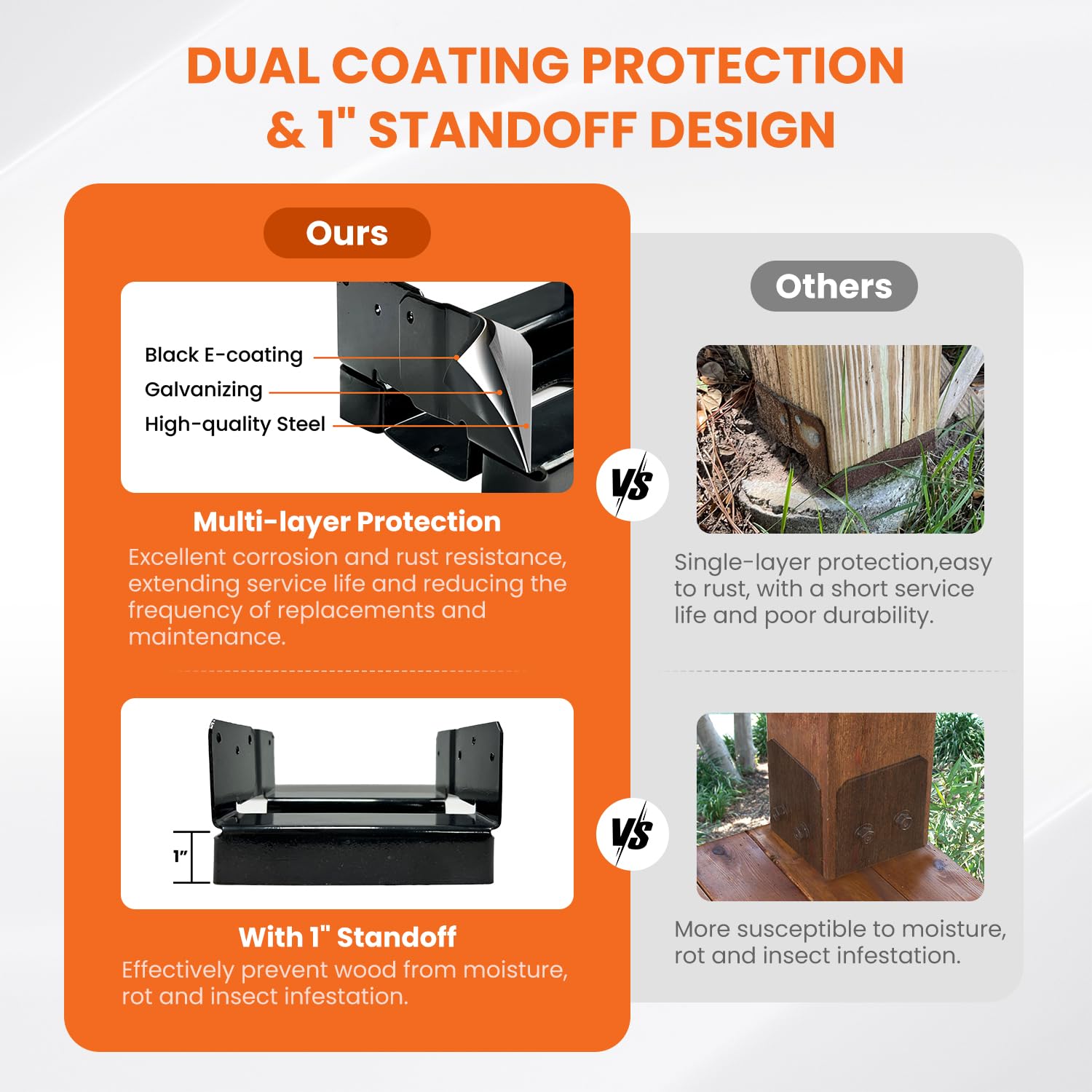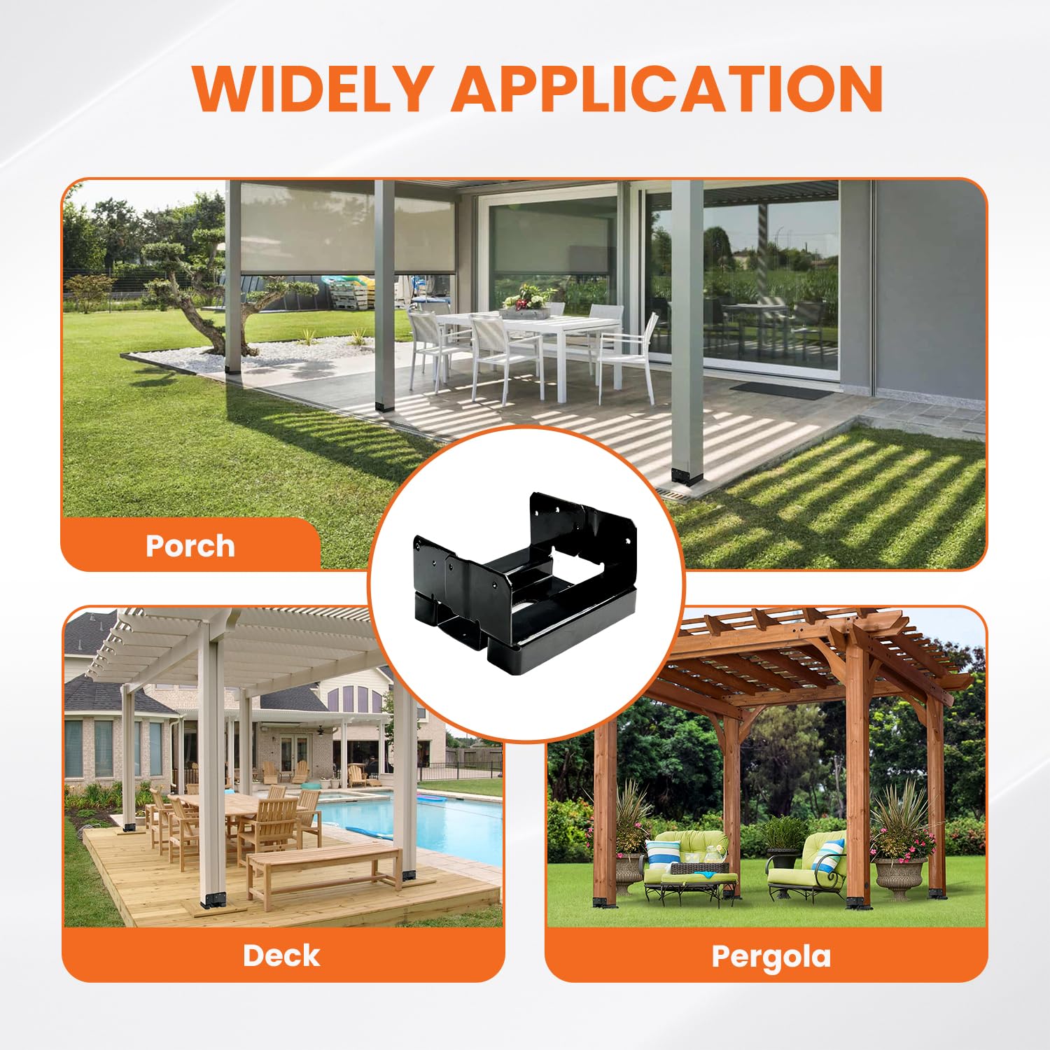 • ?????????-????????? ?-???????: Each 6×6 post bracket is coated with black e-coating and galvanization, providing superior corrosion resistance and rust prevention.This dual-layer protection ensures a long lifespan while significantly reducing maintenance and replacement frequency.