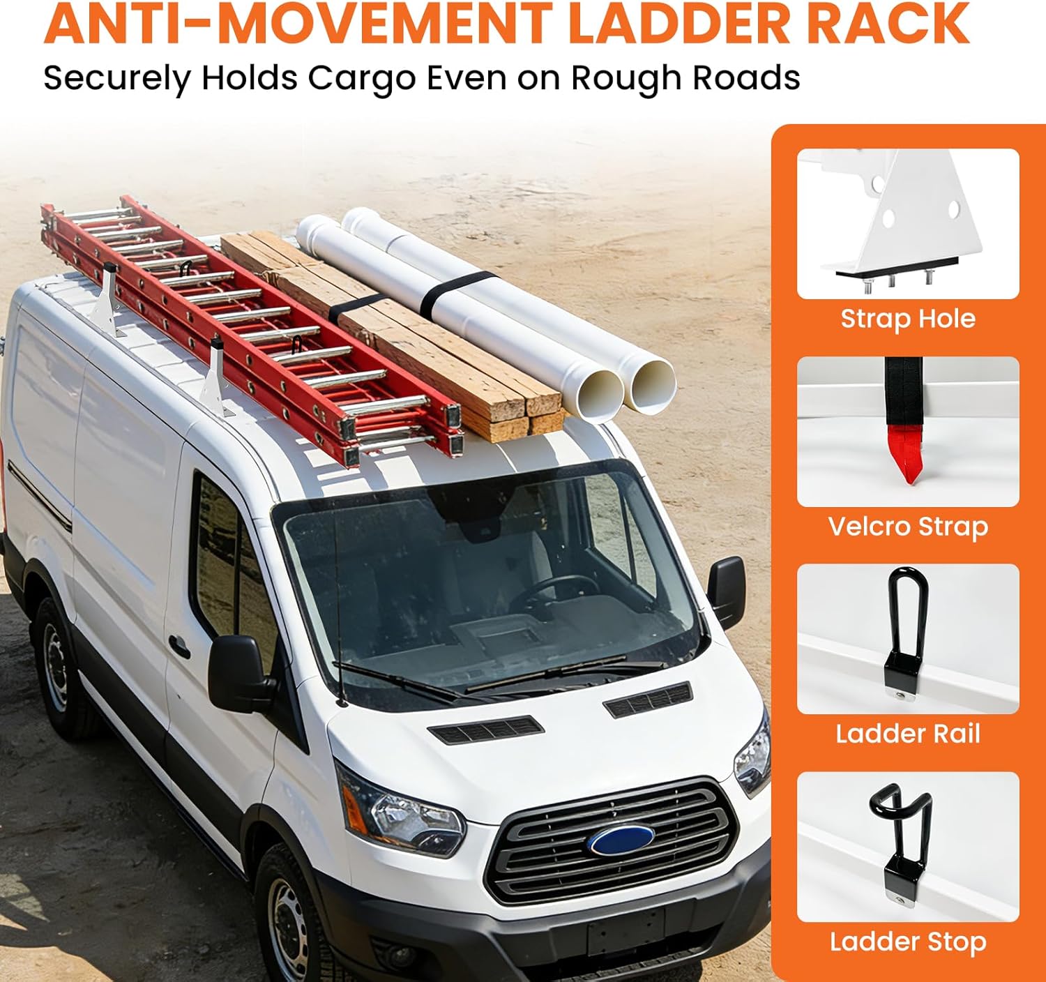 - 【?????? & ????? ?????????】.EONECROSS Van Ladder Rack features reinforced rails and stoppers to keep cargo firmly secured. Rubber caps eliminate wind noise for quiet highway driving. Dual nylon straps, stoppers, and anti-skid tape prevent any shifting. Designed for secure, silent transport – no rattling even on rough roads.