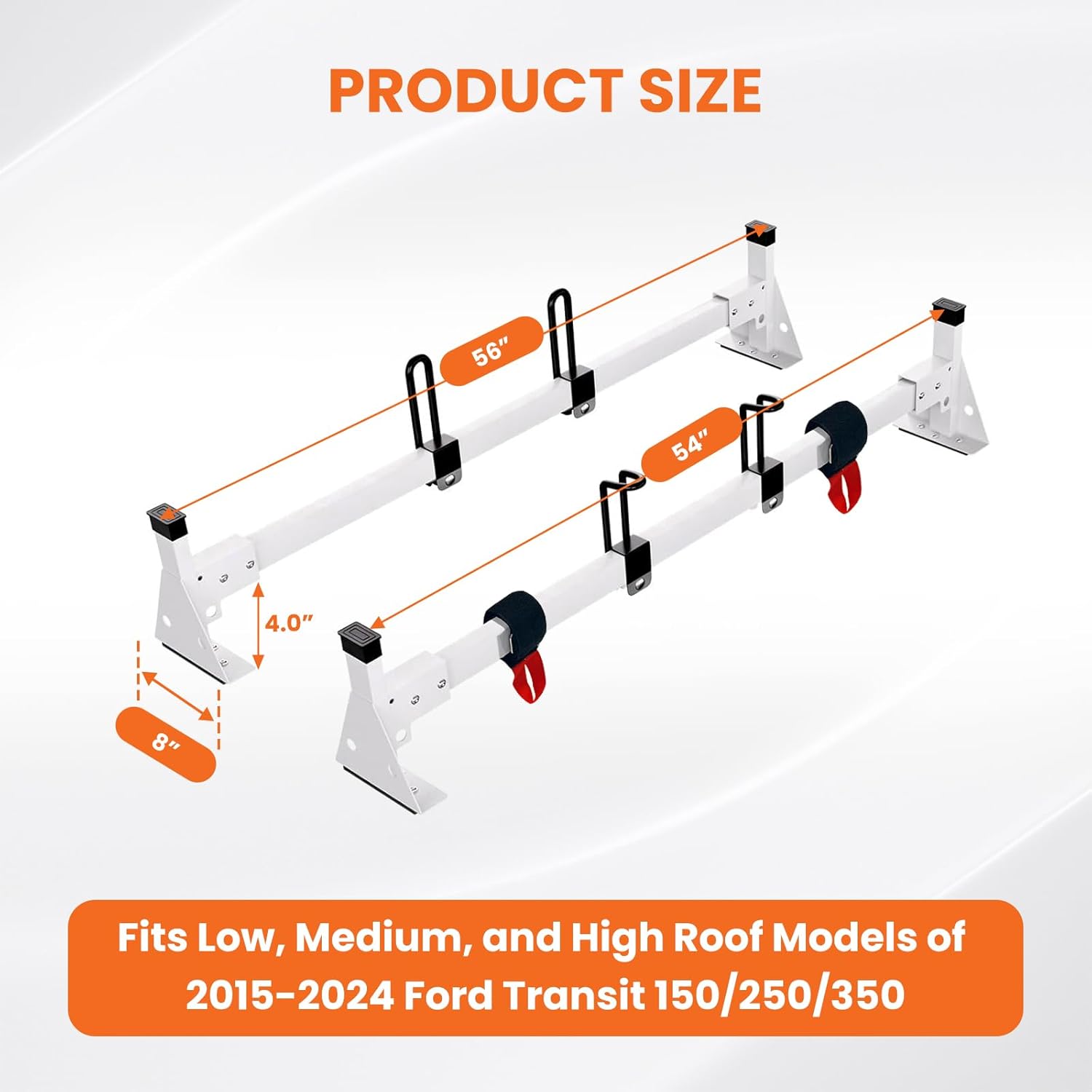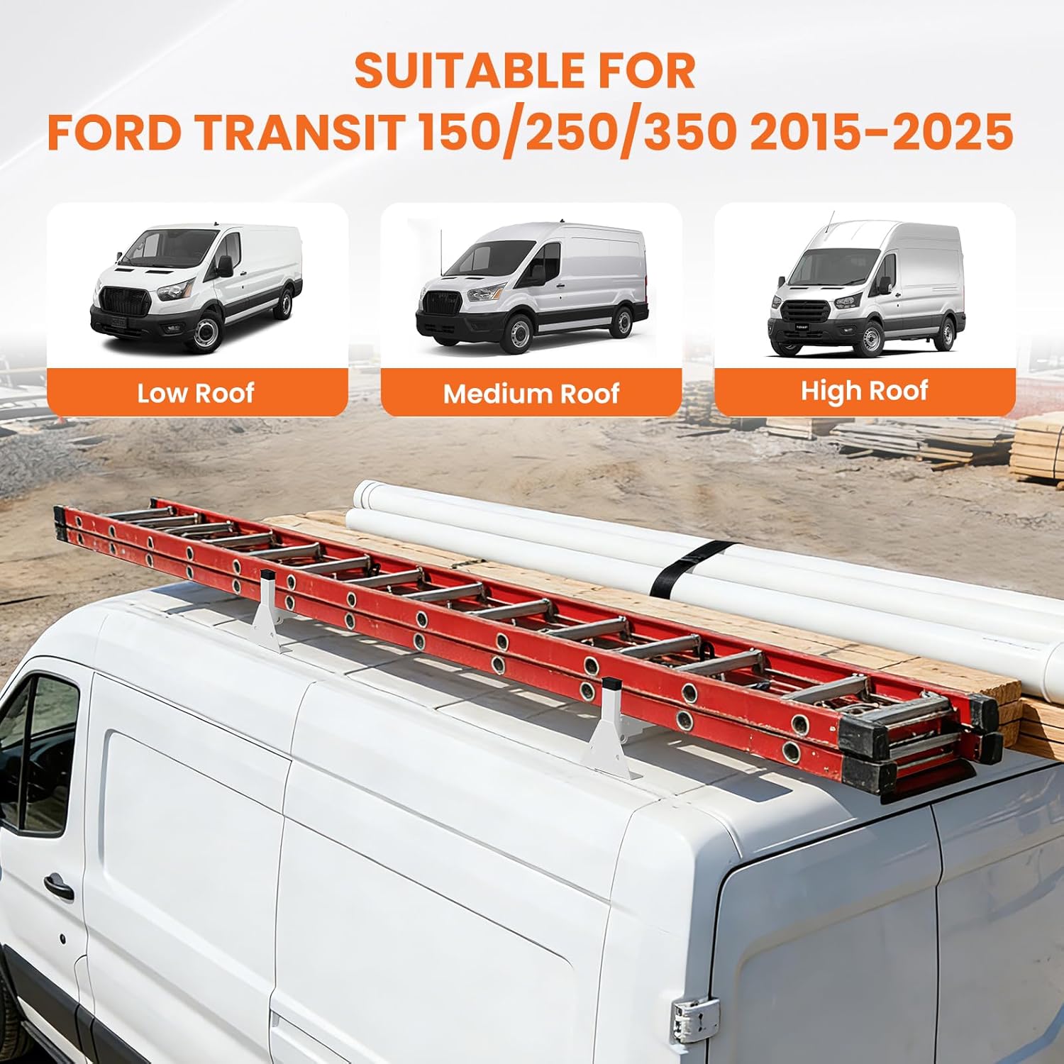 - 【???? ???????????? & ???? ?????????????】.This van ladder rack is compatible with 2015–2025 Ford Transit 150/250/350 models with low, mid, high roofs. It installs easily using factory mounting points—no drilling required. Adjustable crossbars with pre-drilled holes ensure a perfect fit and hassle-free setup.