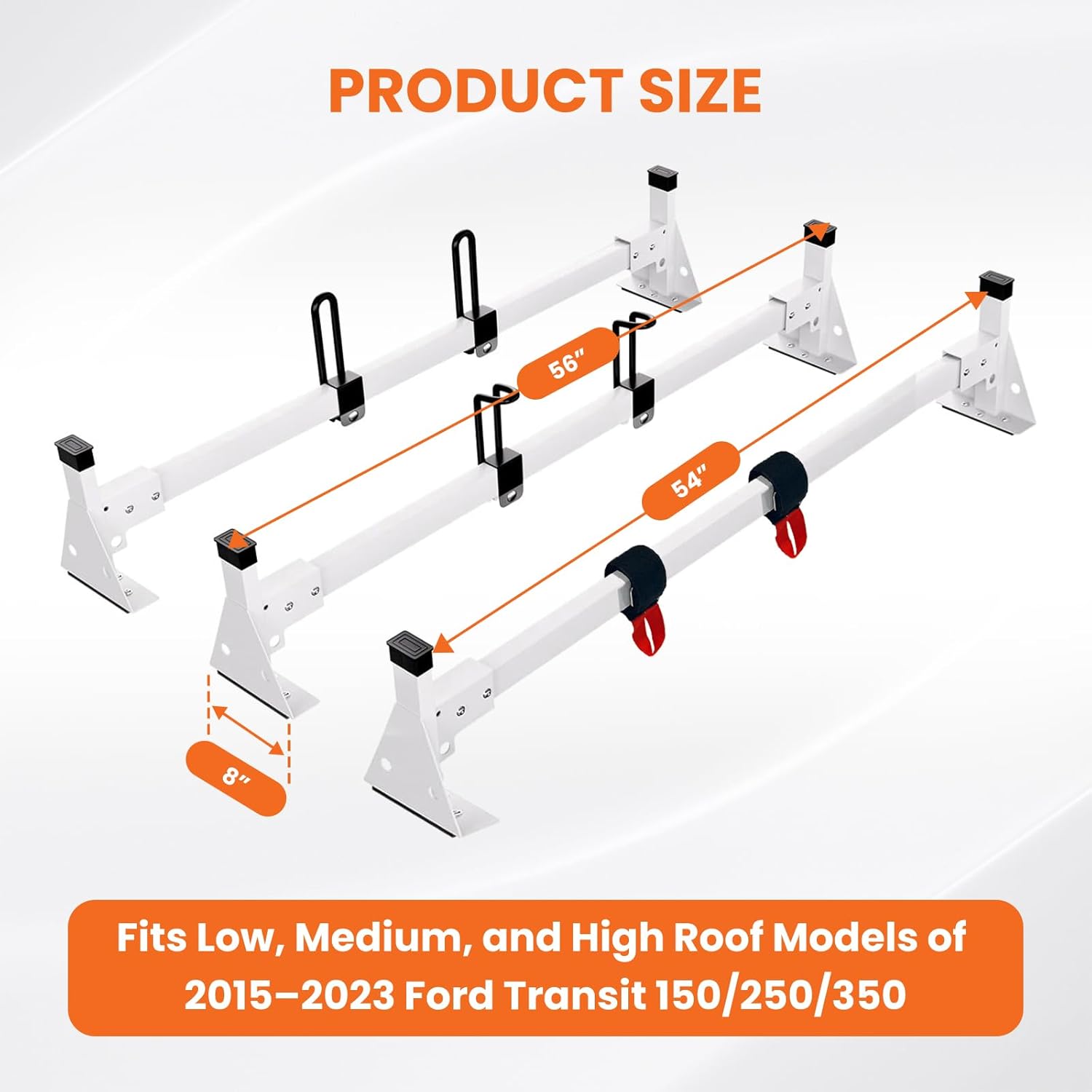 - 【???? ???????????? & ???? ?????????????】.This van ladder rack is compatible with 2015–2025 Ford Transit 150/250/350 models with low, mid, high roofs. It installs easily using factory mounting points—no drilling required. Adjustable crossbars with pre-drilled holes ensure a perfect fit and hassle-free setup.